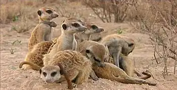 Zaphod's younger brother, Yossarian, is named after the main character in Catch-22 and has a scar across his left eye. In the third episode of the series, the narrator states that Yossarian was once Flower's mate and the dominant male of the Whiskers, but Zaphod dethroned him before the series started.[6] The Meerkat Manor: The Story Begins film states that Yossarian and Zaphod were once roving Lazuli males. Yossarian became the dominant male of the Whiskers when Flower's sister was the dominant female, and then left the group when Flower assumed the role.[5] Noted as having "some social problems"[6] and being a trouble-maker, Yossarian initiated two burrow moves while babysitting twice in the first series, but both were badly handled.[6] The first attempt resulted in a lot of confusion amongst the babysitters, resulting in the eight newborn pups Yossarian dragged out of the burrow being partially trampled and almost left to die in the desert sun.[6] Pooky, one of the other babysitters, was able to restore order and get the pups to the burrow. A few days later he tried again. This time the babysitters joined him, but as they carried the newborn pups to a new burrow, they passed the main group and Flower and Zaphod ran after them. To avoid Flower's wrath, Yossarian dropped the pup of Mozart that he was carrying and slunk off. The pup died as a result and the rest of the Whiskers temporarily ostracised Yossarian for the havoc wrought by these moves.[18] Yossarian's attempt to help Daisy by carrying her newborn pups to the Whiskers burrow separated him from the family.[10] He also rescued one of Flower's pups in the second series after the young pup had wandered too far from the safety of the burrow.[19]