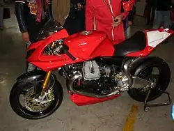 - MGS-01 Corsa (1,222 cc) (since 2004) (track only): a very limited production racing bike — introduced at Intermot 2002 (Cologne Motorcycle Show) as a prototype. The bike had been designed starting in 2002 with the Moto Guzzi Style Laboratory and a team at Ghezzi & Brian—with co-founder Giuseppe Ghezzi.[8] The MGS-01 features an air-cooled 1,256 cc four-stroke engine with high compression three-segment Cosworth pistons, ceramic-coated cylinders, bushings instead of bearings, upside-down front fork, extra long swinging fork swingarm in box section aluminium,[8] rear single shock absorber vertically located, disc hydraulic drive clutch, one-piece quick-release carbon fiber body design, Brembo brakes with radial mounted calipers,[8] six-speed gearbox (as a structural component of the bike) and shaft drive — weighing in at 423 pounds (192 kg). As a pure racing bike, the MGS-01 Corsa was originally intended for a domestic Italian homologation model, though has since been raced (successfully) also in the US. Production was highly limited, with bikes shipped in special wooden crates carrying a special MGS-01 logo on the outside and a personalized spiral-bound and owners, parts and maintenance manual. Moto Guzzi continues to supply engines to Ghezzi & Brian for their own line of production custom bikes.