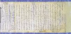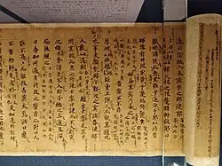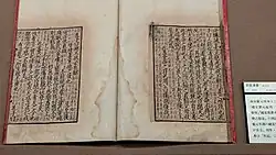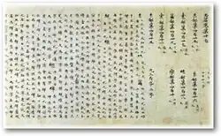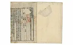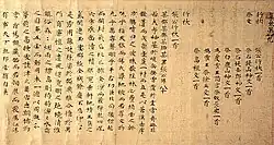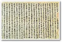 The term "National Treasure" has been used in Japan to denote cultural properties since 1897,[1][2] although the definition and the criteria have changed since the introduction of the term. The written materials in the list adhere to the current definition, and have been designated National Treasures according to the Law for the Protection of Cultural Properties that came into effect on June 9, 1951. The items are selected by the Ministry of Education, Culture, Sports, Science and Technology based on their "especially high historical or artistic value".[3][4] The list presents 57 entries from the 7th century Tang dynasty to the Kamakura period with more than half originating in China. The total number of items is higher, however, since groups of related objects have been joined as single entries. The list contains works that have been originally compiled in China by Chinese authors. A large proportion of these works are Chinese classics.[4]