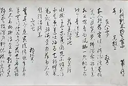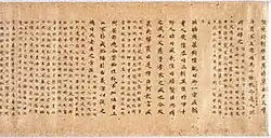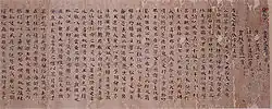 Chinese books had reached Japan since circa 400 AD and had been imported in large quantities through a number of missions during the Sui and Tang dynasties. Official missions ended after 894, but books continued to reach Japan in the mid to late Heian period through commercial exchange or via priests travelling to China.[49] Imported Chinese books were copied at Japanese libraries, but unlike sutra copying little is known about the actual copying process of Chinese secular works in Japan.[50] The Japanese aristocracy and clergy sponsored the transcription of religious and government texts on a large scale by the Nara period.[51]