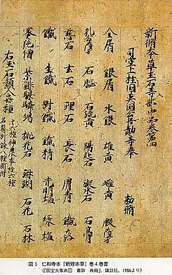 - ^ 新修本草 仁和寺本 [Newly Revised Pharmacopoeia, Ninna-ji edition]. MAYANAGI's Laboratory for the History of Chinese Science (in Japanese). Ibaraki University. Archived from the original on 2011-07-22. Retrieved 2010-10-02.