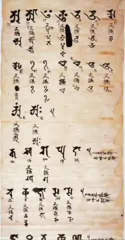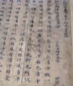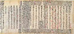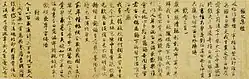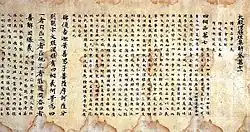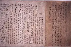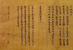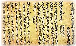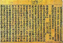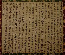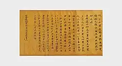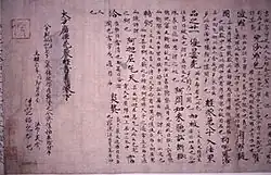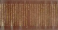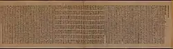 The peak of sutra copying occurred in the Nara period at which time the Great Perfection of Wisdom (Daihannya) sutra and the Lotus Sutra were the sutras most often copied.[17][20][21] Most of the sutras were written in black ink on paper dyed pale yellow.[nb 5][22] However, some were made with gold or silver ink on indigo, purple or other colored paper—particularly the ones that were produced in 741 when Emperor Shōmu decreed Konkōmyō Saishōō sutras written in gold letters be distributed among provincial temples.[8][22][23][24] Many sutra copies contain a colophon with the name of the sponsor—often somebody from the ruling class—and the reason of copying, usually related to the health or salvation of people or the state.[13][21]