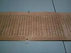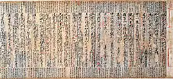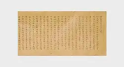 The list contains various types of written materials such as sutra copies, Buddhist commentaries and teachings, poetry and letters. Some of the designated objects originated in China, and were imported at a time when writing was being introduced to Japan. The items in this list were predominantly made with a writing brush on manuscript scrolls, which was the preferred medium until the advent of commercial printing and publishing in the 17th century.[5] In many cases the manuscripts are noted examples of calligraphy. They are housed in temples, museums, libraries or archives, shrines, universities and in private collections.[4] The writings in this list represent about half of the 235 National Treasures in the category "writings". They are complemented by 71 Japanese and 57 Chinese book National Treasures of the List of National Treasures of Japan (writings: Japanese books) and the List of National Treasures of Japan (writings: Chinese books).[4]