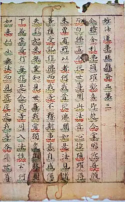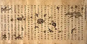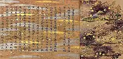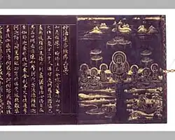 After the shakyōjo closed at the end of the 8th century, the imperial family and leading aristocrats continued to sponsor sutra copying.[18] Because of an enhanced belief in the powers of the Lotus Sutra, more Heian period copies of this sutra exist than of all other sutras combined.[25] Starting in the early Heian period, styles became flowery and ornate with lavish decorations as sutras were not used only in recitation but for dedication and sacrifice.[22][26][27] Devotional sutra copying was more often undertaken by the initiator than in the Nara period.[8][25] New forms of decoration came in fashion by the early-11th century including placing each character in the outline of a stupa, on lotus pedestals or next to depictions of Boddhisattvas.[28][29] Sutras were increasingly furnished with frontispieces starting in the 11th century.[28] Calligraphy shifted from Chinese to Japanese style.[30] Sutra copying continued into the Kamakura and subsequent periods, but only rarely to comparable artistic effect.[29] With the import of printed Song editions in the Kamakura period, hand-copying of the complete scriptures died out and sutra copying was only practiced for its devotional aspect.[31][32] Fifty-one sutras or sets of sutras from the 6th century Western Wei to 14th century Nanboku-chō period have been designated National Treasures. Some of the oldest items in this list originated in China.[4]