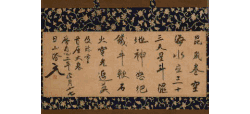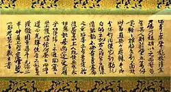 | Lotus Sutra on deep blue paper (紺紙金字法華経, konshikinji hokekyō) and Samantabhadra Contemplation Sutra on deep blue paper (紺紙金字観普賢経, konshikinji kanfugenkyō)[48] | Taira no Kiyomori and his younger brother Yorimori | First couple of lines of each scroll transcribed by Taira no Kiyomori, following lines by Yorimori; therefore also called (両筆経; lit. Sutra written together) | Heian period, 1170–1172 | Seven handscrolls (Lotus Sutra) and one handscroll (Samantabhadra Contemplation Sutra), gilt letters on deep blue paper | Itsukushima Shrine, Hatsukaichi, Hiroshima |