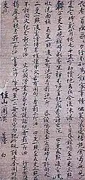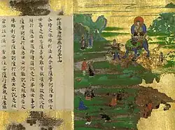 The concept of writing came to Japan from the Korean kingdom of Baekje in the form of classical Chinese books and sutras, likely written on paper and in the form of manuscript rolls (kansubon).[6][7][8][9] This probably happened at the beginning of the 5th century (around 400), and certainly in conjunction with the introduction of Buddhism in the 6th century.[7][10] The increasing popularity of Buddhism, strongly promoted by Prince Shōtoku (574–622), in the late-6th century and early-7th century was one of the factors[nb 3] leading to a rise in the importance of writing.[11] Buddhism required the study of sutras in Chinese. To satisfy the growing demand for them, imported Sui and Tang manuscripts were copied, first by Korean and Chinese immigrants, and later in the mid-7th century by Japanese scribes.[12][13] The Sangyō Gisho ("Annotated Commentaries on the Three Sutras"), traditionally attributed to Prince Shōtoku, is the oldest extant Japanese text of any length.[14] By 673 the entire Buddhist canon had been systematically copied.[8][15] Not a single sutra survives from before the end of the 6th century.[16] The oldest extant complete sutra copied in Japan dates to 686 and has been designated a National Treasure.[15][17] During the 7th and 8th centuries, the copying of Buddhist texts, including sutras, dominated writing. Few Chinese secular or local Japanese works (which were rare) were copied.[17] The state founded a Sutra Copying Bureau (shakyōjo) before 727[nb 4] with highly specialized calligraphers, proofreaders and metal polishers to satisfy the large demand for Buddhist texts.[8][11][14][15][18] Sutra copying was not only for duplication but also to acquire religious merit;[15][19] thus nearly all Buddhist texts were hand-copied during the 8th century despite knowledge of printing.[14]