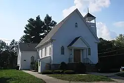 "The New Durham Meetinghouse was built by settlers from Durham and nearby towns in 1770 as their house of worship and seat of government until 1819 when the town's first church was built. This area was the town center until the 1850s when the arrival of the railroad favored development in 'The Plains.' The Meetinghouse was reduced to 1 story in 1838, vacated in 1908. The town had it listed in the National Register in 1980. It can be found by following Davis Crossing Rd and turning left on Old Bay."[30]