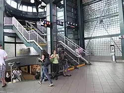 The elevated IRT Flushing Line and underground IND Queens Boulevard Line are connected inside fare control in Jackson Heights. A paper transfer was added on July 1, 1948,[4] and was later replaced by a passageway in 2005 when the station was rebuilt. |