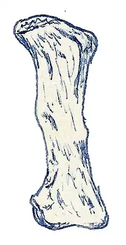 The only recorded find of a dinosaur fossil in Central America consists of a single femur discovered from Middle Cretaceous age deposits in Comayagua Department in the central part of Honduras. The fossil had been found in January, 1971 by Bruce Simonson and Gregory Horne, though it was later sent to the National Museum of Natural History, USA where it is deposited under catalogue number USNM PAL 181339. The discovery was not formally described until 1994 where it was identified as the femur of a small hadrosaur or iguanodontid, probably the former.[3] The first report of a dinosaur from Central America ever however was a newspaper article published in August of 1933 by Canada's Montreal Gazette, though the story was picked up by several American newspapers. The fossil was an isolated metatarsus that had been collected by University of Pennsylvania explorer George Mason from woods near Olanchito, Honduras, though a vertebra was also mentioned to be found by locals. The bones have since been lost and their true identity remains indeterminable.[4]