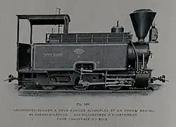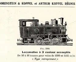 12. ^ Locomotive a 3 essieux accouples de 10 a 16 tonnes pour voies de 1000 et 1445 mm "Type entrepreneur" (O&K steam locomotive, works N° 1080, June 1903, 80 hp, 1000 mm gauge, Ct, 'Jallut über O&K Fil Brüssel'.)