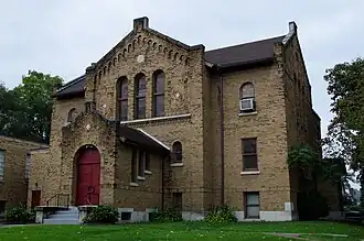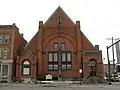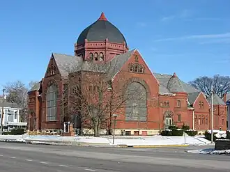 Romanesque Revival; polychrome masonry; one of three contributing buildings in Wolcott Square Historic District
