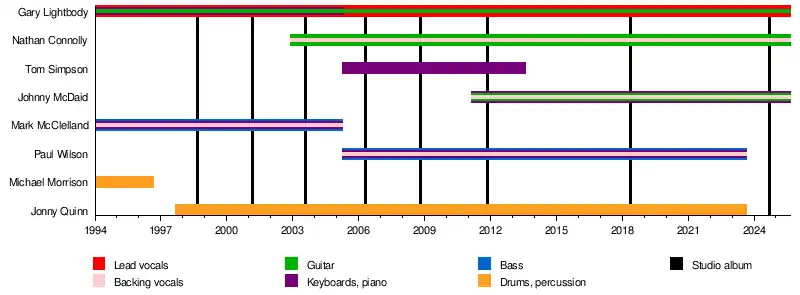 The drummer position was briefly filled by Richard Colburn,[2] before Jonny Quinn joined as full time drummer. In 2001, the band were joined on tour by songwriter Iain Archer, who performed guitar and backing vocals.[3] In 2002, Archer was replaced by Nathan Connolly who became an official member.[4] The band parted ways with McClelland,[5] he was replaced by Paul Wilson who had previously toured with the band on guitar and keyboards.[6] The band also added long-time touring keyboardist Tom Simpson as an official member.[7]