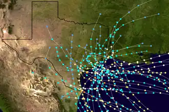 The third storm of 1875 Atlantic hurricane season hit Indianola, Texas at that intensity on the September 16. It turned northeastward, dissipating over Mississippi. The storm brought strong storm surge to the Texas coast, causing heavy damage and a total of 800 deaths. The storm was the first of two hurricanes to devastate Indianola, the other being the Indianola Hurricane of 1886.[10]