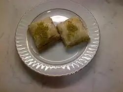 | Soğuk baklava | Phyllo pastry, dairy | Thin layers of phyllo brushed with clarified butter, poured with a type of cold sharbat syrup consists of milk and sugar and served with cocoa or grated chocolate on top. | |
