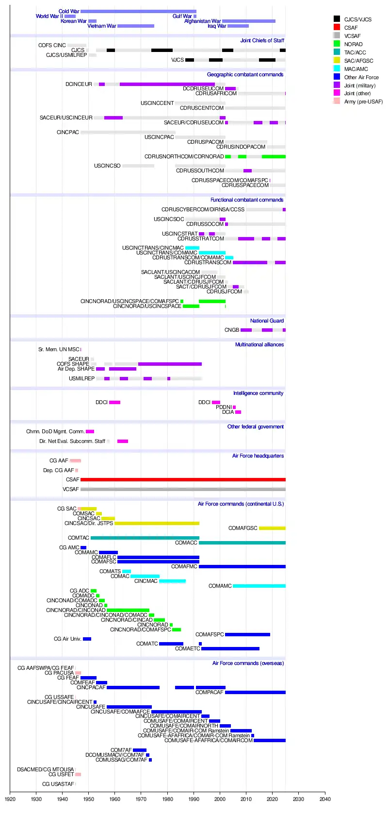 - ^ Sources of commission are listed in parentheses after the year of commission and include: the United States Air Force Academy (USAFA); the United States Military Academy (USMA); the United States Naval Academy (USNA); Reserve Officer Training Corps (ROTC) at a civilian university; Air Force Reserve Officer Training Corps (AFROTC) at a civilian university; ROTC or AFROTC at a senior military college such as Texas A&M University (Texas A&M), the Virginia Military Institute (VMI), or Virginia Polytechnic Institute and State University (VPI); Air Force Officer Training School (OTS); Officer Candidate School (OCS); the aviation cadet program (cadet); the Army National Guard (ARNG); the Royal Canadian Air Force (RCAF); and direct commission (direct).