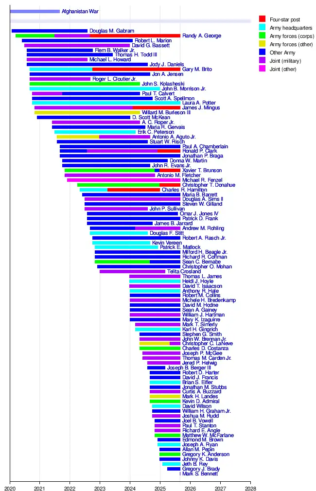 - ^ a b Positions listed are those held by the officer when promoted to lieutenant general. Dates listed are for the officer's full tenure, which may predate promotion to three-star rank or postdate retirement from active duty. Positions held in an acting capacity are italicized.
