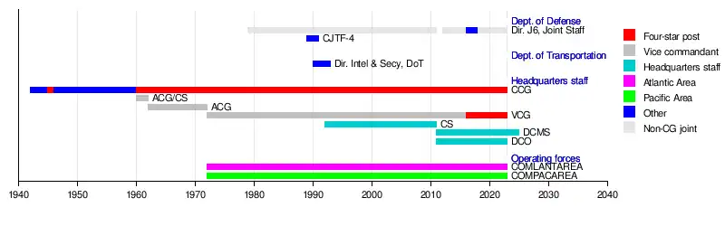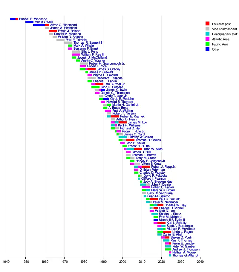 - ^ a b Sources of commission are listed in parentheses after the year of commission, and include the United States Coast Guard Academy (USCGA), United States Merchant Marine Academy (USMMA), United States Revenue Cutter Service School of Instruction (USRCSSI), and officer candidate school (OCS).