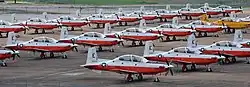 - ^ The T-6A was an exception as when the USAF and Navy both adopted the Joint Primary Aircraft Training System (JPATS) T-6A aircraft, the USAF aircraft were to be delivered first with the Navy receiving their aircraft after the USAF. However beginning in 2002 while the USAF was still receiving its aircraft 40 T-6As were delivered to the Navy, they were delivered in the USAF blue and white color scheme and they were all assigned to NFO training at NAS Pensacola. After delivery of the USAF aircraft was completed, in 2009 the Navy's pilot training T-6Bs began delivery in the Navy's orange and white paint scheme and the 40 NFO T-6A trainers were eventually repainted in the Navy orange and white scheme