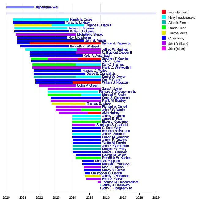 - ^ a b Positions listed are those held by the officer when promoted to vice admiral. Dates listed are for the officer's full tenure, which may predate promotion to three-star rank or postdate retirement from active duty. Positions held in an acting capacity are italicized.