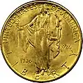 | $2.50 | United States Sesquicentennial quarter eagle | Liberty, bearing a scroll representing the United States Declaration of Independence and a torch | Independence Hall, with sunlight behind it | 90% Au, 10% Cu | Authorized: