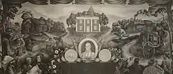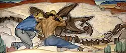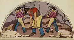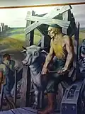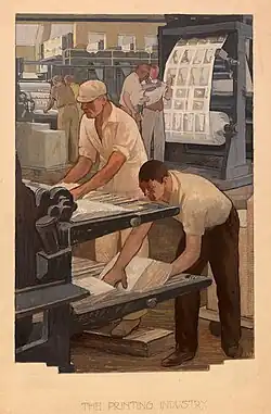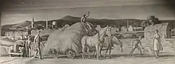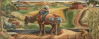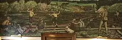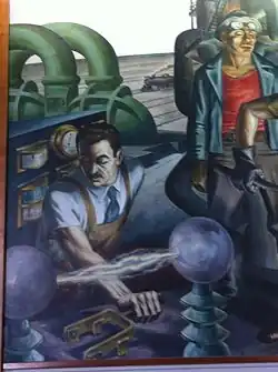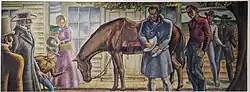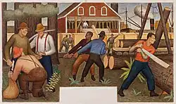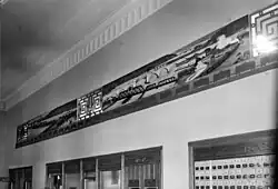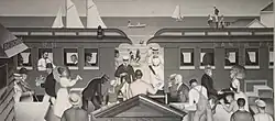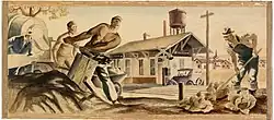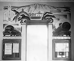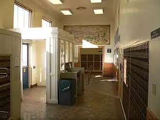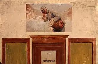 From 1934 to 1943, the Procurement Division of the United States Department of the Treasury commissioned murals in post office buildings across the country. Part of the New Deal, the stated objective of commissioning United States post office murals was to secure artwork that met high artistic standards[2] for public buildings, where it would be accessible to all people.[3] The murals were intended to boost the morale of the American people suffering from the effects of the Depression by depicting uplifting subjects the people knew and loved.[4] Murals produced through the Treasury Department's Section of Painting and Sculpture (1934–1943) were funded as a part of the cost of the construction of new post offices, with 1% of the cost set aside for artistic enhancements.[5] Murals were commissioned through competitions open to all artists in the United States.[6] Almost 850 artists were commissioned to paint 1,371 murals, most of which were installed in post offices;[5] 162 of the artists were women and three were African American.[5] The Treasury Relief Art Project (1935–1938), which provided artistic decoration for existing Federal buildings, produced a smaller number of post office murals.[2] TRAP was established with funds from the Works Progress Administration. The Section supervised the creative output of TRAP, and selected a master artist for each project. Assistants were then chosen by the artist from the rolls of the WPA Federal Art Project.[7]: 62–63