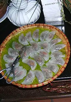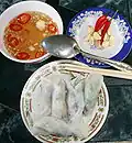 Huế | Dumpling | Flat rice flour dumpling from Huế stuffed with minced pork and mushroom, and seasoned with pepper and spices; wrapped in a banana leaf[2] |