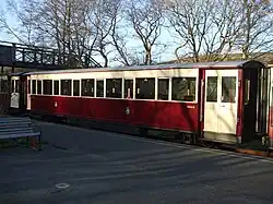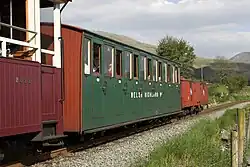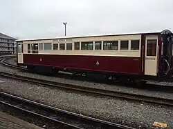 | 23 | 1894 | Ashbury Carriage & Wagon Co | 7 compartment | 42 | ![]() Built for the North Wales Narrow Gauge Railways became Welsh Highland Railway property in 1923 and was reduced in height to fit the FR loading gauge. Became Ffestiniog Railway property (in exchange for three bogie wagons) in 1926. Prior to this exchange, this carriage had been WHR No 24. Subsequent to the exchange, the number "24" was allocated to Ashbury "Corridor" No. 23, re-establishing the division between FR and WHR stock in the combined stock list. No 23 returned to FR service in 1955 and full doors fitted in 1966. Refurbished in 2002 and returned to the WHR. |