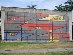 Villanueva approached Armando Barrios in 1952[18] to create a number of murals for the campus. Barrios' murals are mosaics made of glass, and are considered part of his "abstract-geometric" period. After 1954, his work became less abstract and incorporated more identifiable human figures.[19] As a music lover, Barrios incorporated a musical flow into his designs.[20]