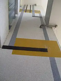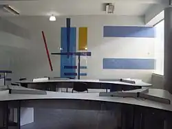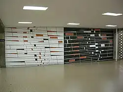 | Untitled mural | Rectangle and similar shapes in various shades of grey create a pattern on a wall behind stairs, there are some orange rectangles near the top | 1953 or 1954 | In the atrium of the Aula Magna[26] | A2 |