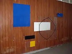 | Untitled mural | Plastic quadrangles, all aligned with a side parallel to the floor, are arranged across a wooden wall. The squares and rectangles are in blue, yellow, white and black, with some being transparent. One large transparent square overlaps another shape, and has an irregular pentagon with curved lines on it in black. | 1956 | On the first floor of the Faculty of Architecture and Urbanism, in front of the study control | AU17 |