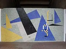 The Olympic Stadium murals use mosaic tiles imported from Venice. The mural here with horizontal stripes is also considered "melodic", with Ronnie Saravo Sánchez writing that the use of color and the Renaissance influence "link it conceptually with movements such as Cubism and Russian constructivism, [and] served as a support for the creation of a new universe where the figure and background are diluted until reaching an almost abstract stylization".[19]