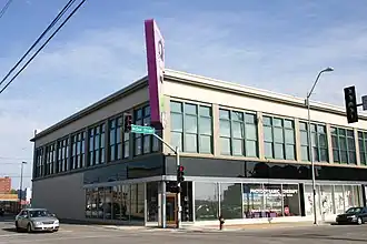 Streamline Moderne-style, designed by Naramore, Bain, Brady, and Johanson. Formerly a Dodge dealership, renovated in 1997 to become a library.