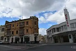 Romanesque Revival-styled. Served as auto sales dealership building, is now a theatre.