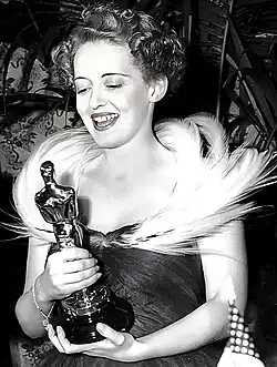 Her first acting "award" was being cited, alongside Joan Blondell and Ginger Rogers, as one of the "Stars of Tomorrow" in 1932. But it was two years later, when she had her breakthrough performance as Mildred Rogers in Of Human Bondage (1934), when she received her first major awards notice, or lack thereof. When the Academy Award nominations were announced and Davis's name was omitted, there was an uproar. The Academy was inundated with write-in votes demanding that she be nominated.[1] Due to that popular demand, they permitted Davis's name to remain a write-in candidate, even though she was not an official nominee. She finished third in the votes.[2] (They allowed this relaxed rule for the following year as well, wherein Paul Muni was a write-in nominee for Black Fury (1935). Despite being unofficial, he finished second in the votes. The academy discontinued this option as of 1936.)[3]