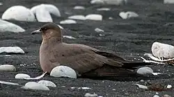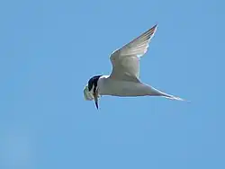 A variety of seabirds breed on the coastal cliffs such as Atlantic puffin, black guillemot, black-legged kittiwake, European shag and northern fulmar.[2] The island gives its name to the Manx shearwater which formerly nested in large numbers on the Calf of Man. The colony disappeared following the arrival of rats but the shearwaters began to return in the 1960s.[2] The Ayres in the north of the island have colonies of little tern, Arctic tern and common tern.[2]
