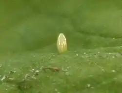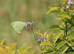 Whites and sulphurs are small to medium-sized butterflies. Their wingspans range from 0.8 to 4.0 inches (2-10.2 cm). There are about 1,000 species worldwide with about 61 species in North America. Most whites and sulphurs are white, yellow, and orange with some black, and some may be various shades of gray green. Their flight is mostly slow and fluttering, but some of the larger species have quicker flights. Both males and females like to feed at flowers, while males also like to puddle on damp ground. Male whites and sulphurs locate females by patrolling. The eggs are spindle shaped and laid singly. Most of the long-slender larvae are green or yellow. The chrysalis is usually triangular or cone headed. It hangs upright supported by a silken loop around the middle. The overwintering varies with species. It may be larva, chrysalis, or adult.