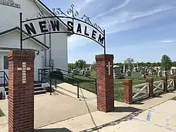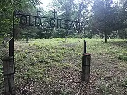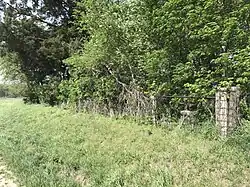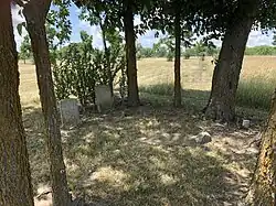 Church Antioch Cemetery is located on the north side of Mexico Gravel Road east of the Hinkson Creek bridge. Antioch Church was built here during the summer and fall of 1853. Prior to that the congregation was called Bear Creek Church and was located in a log cabin on the banks of Bear Creek.[6] At some point the congregation and church building ceased to exist. As of 2018 the cemetery is fenced and mowed, however, there are toppled and buried monuments.