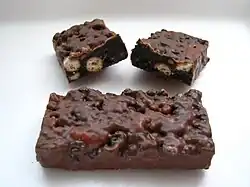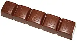 This is a list of chocolate bar brands, in alphabetical order, including discontinued brands. A chocolate bar, also known as a candy bar in American English, is a confection in an oblong or rectangular form containing chocolate, dark chocolate, or white chocolate, which may also contain layerings or mixtures that include nuts, fruit, caramel, nougat, and wafers.