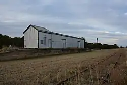 Goods shed, platform and tracks at Pinnaroo, South Australia, looking east from the railway station