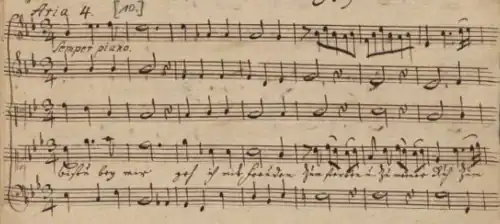 - "Saitenspiel" (String-Music) cycle, thus named after Benjamin Schmolck's second libretto cycle, published in 1720, an "ideal cycle" containing 88 cantata texts. Schmolck provided more than one cantata text for some of the most important feasts. Schmolck's librettos have five sections: Aria, Recitative, Aria, Recitative and Aria. Stölzel split the librettos he used in two halves, adding a chorale from the hymnal used in Gotha as a conclusion of each half: thus the structure of his cantatas based on Schmolck's librettos became (Part I:) Aria – Recitative – Aria – Chorale, and (Part II:) Recitative – Aria – Chorale. The cycle was performed in Zerbst (1724–25), after a presumed earlier performance of the cycle in Gotha. Extant music ("A" cantatas formerly associated with the fourth cycle; "C" cantatas recovered in Hamburg):[6][7][8][9][10]