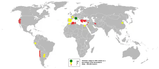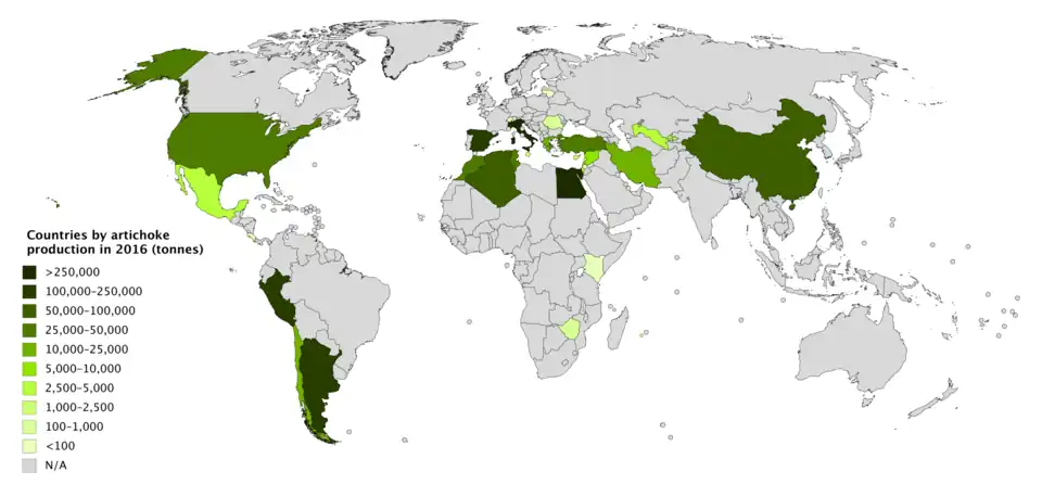 This is a list of countries by artichoke production in 2022, based on data from the Food and Agriculture Organization Corporate Statistical Database.[1] The estimated total world artichoke production for 2022 was 1,584,514 metric tonnes.[1]
