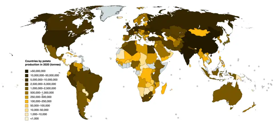 This is a list of countries by potato production from 2016 to 2022, based on data from the Food and Agriculture Organization Corporate Statistical Database .[ 1] The estimated total world production for potatoes in 2022 was 374,777,763 tonnes, up 0.3% from 373,787,150 tonnes in 2021.[ 1] China was the largest producer, accounting for 25.5% of world production, followed by India at 15.0%. Dependent territories are shown in italics.