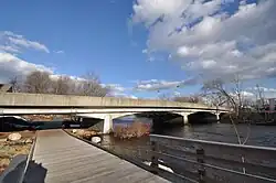 Footbridge from Riverside Rd., Newton to Recreation Rd., Weston pedestrians demolished 2023; replacement under construction, scheduled for completion in 2025[10] 42°20′28.36″N 71°15′29.73″W / 42.3412111°N 71.2582583°W / 42.3412111; -71.2582583 (Newton / Weston pedestrian bridge)