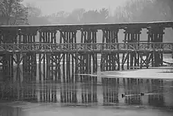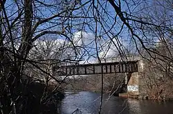 rail bridge Closed. Formerly carried the Charles River Railroad. A proposal was made in 2023 to rehabilitate the bridge as a link in a proposed "Newton/Needham Community Way".[15] 42°18′26.08″N 71°13′26.32″W / 42.3072444°N 71.2239778°W / 42.3072444; -71.2239778 (rail bridge)