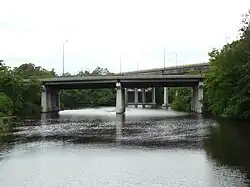 I-95 offramp 180.4 meters (592 ft)[2] northbound exits 23–25; originally Route 128 until 1964 42°20′15.466″N 71°15′26.56″W / 42.33762944°N 71.2573778°W / 42.33762944; -71.2573778 (I-95 offramp bridge)