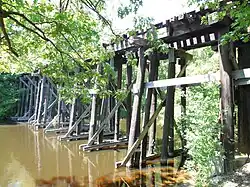 Destroyed railroad bridge Medway Branch 1852 Rail line was abandoned in 1864. Bridge abutments remain. 42°08′06″N 71°21′37″W / 42.135027°N 71.36036°W / 42.135027; -71.36036