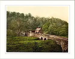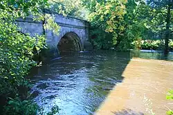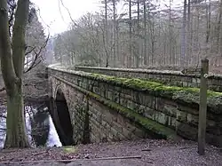 A 17th-century packhorse bridge that was relocated from Derwent village[8]