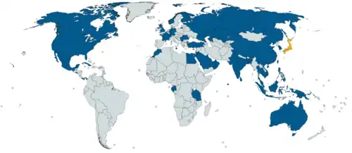 The funeral, which took place at the Nippon Budokan venue in Chiyoda, Tokyo, was expected to be attended by roughly 4,300 people, including around 700 international attendees.[1] Out of the foreign attendees, 49 top-level foreign leaders and 218 foreign delegates, including 101 ambassadors and representatives based in Japan, were present at the state funeral.[2]
