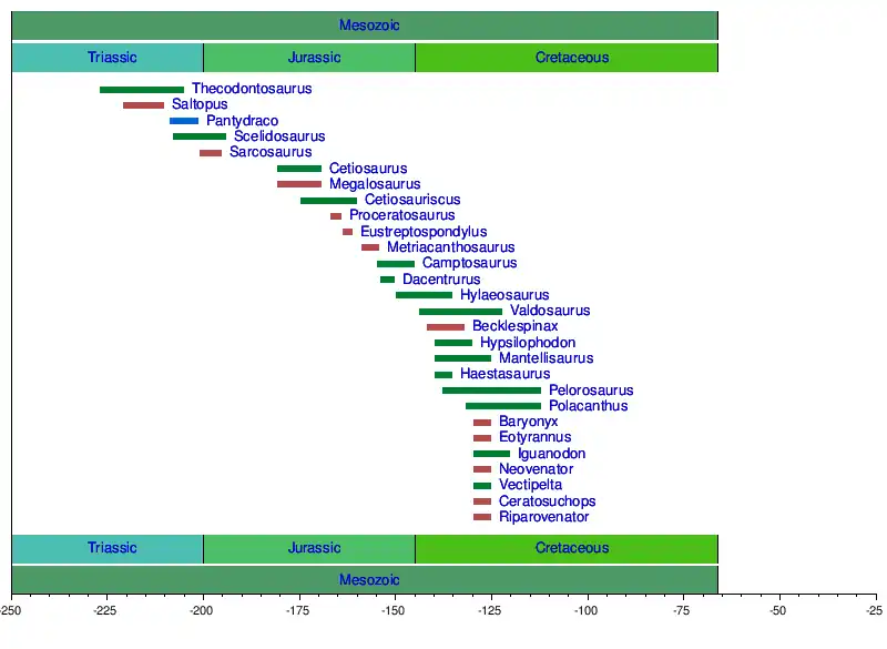 This is a timeline for these dinosaurs during the Mesozoic era. Time is measured in millions of years. Red for carnivores, blue for omnivores, green for herbivores.