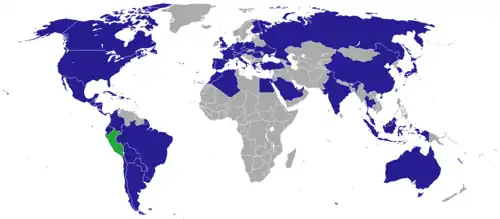 3. ^ a b c d e f g h i j k l m n o p q r s t u v w x y z aa ab ac ad ae af ag ah ai aj ak al am an ao ap aq ar as at au av aw ax ay az ba bb bc bd be bf bg bh bi bj bk bl bm bn bo bp bq br bs bt bu bv "Guía diplomática y lista de organismos internacionales y cuerpo consular" [Diplomatic guide and list of international organizations and consular corps]. Government of Peru (in Spanish). General Directorate of State Protocol and Ceremonials of the Ministry of Foreign Affairs of Peru. 14 May 2025. Retrieved 21 May 2025.